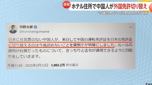 前日本数字大臣河野太郎在社交网络上发布的一个帖子成为了焦点。据河野表示,日本厅已经明确表示,今后不允许没有住民票的中国人更换日本驾照。