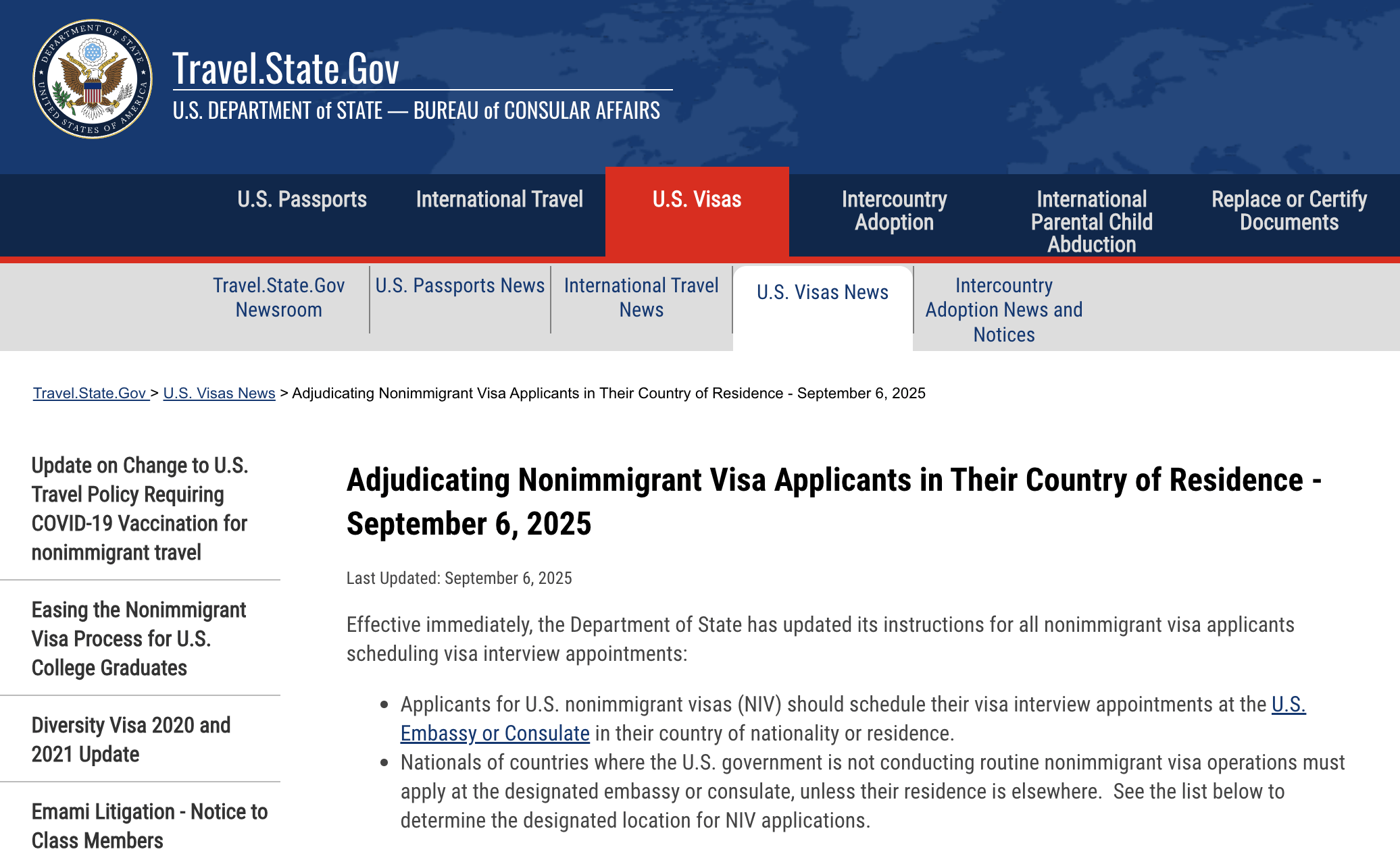 9月6日,美国国务院在官网发布非移民签证(NIV)审理新规,同步更新了全球申请人的签证面谈预约指引,并立即生效。这一调整直接关系到各类赴美观光、工作开云Kaiyun官方网站、学习等人群的签证申请流程,尤其是预约地点、资格审核、费用退还等关键环节均有明确要求。